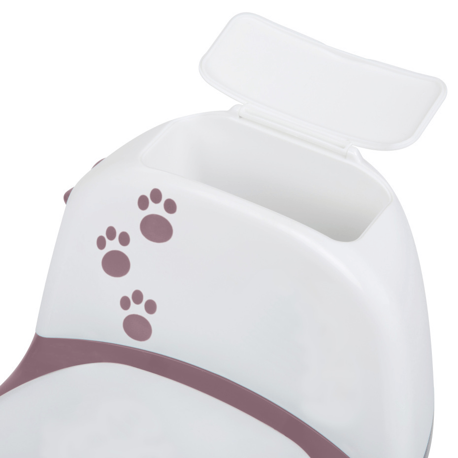 • A small compartment with a lid provides an easy place to store toilet paper or wipes.