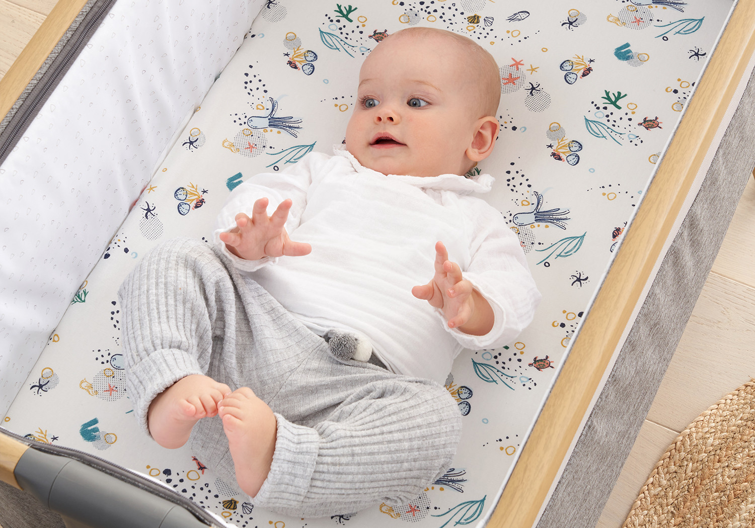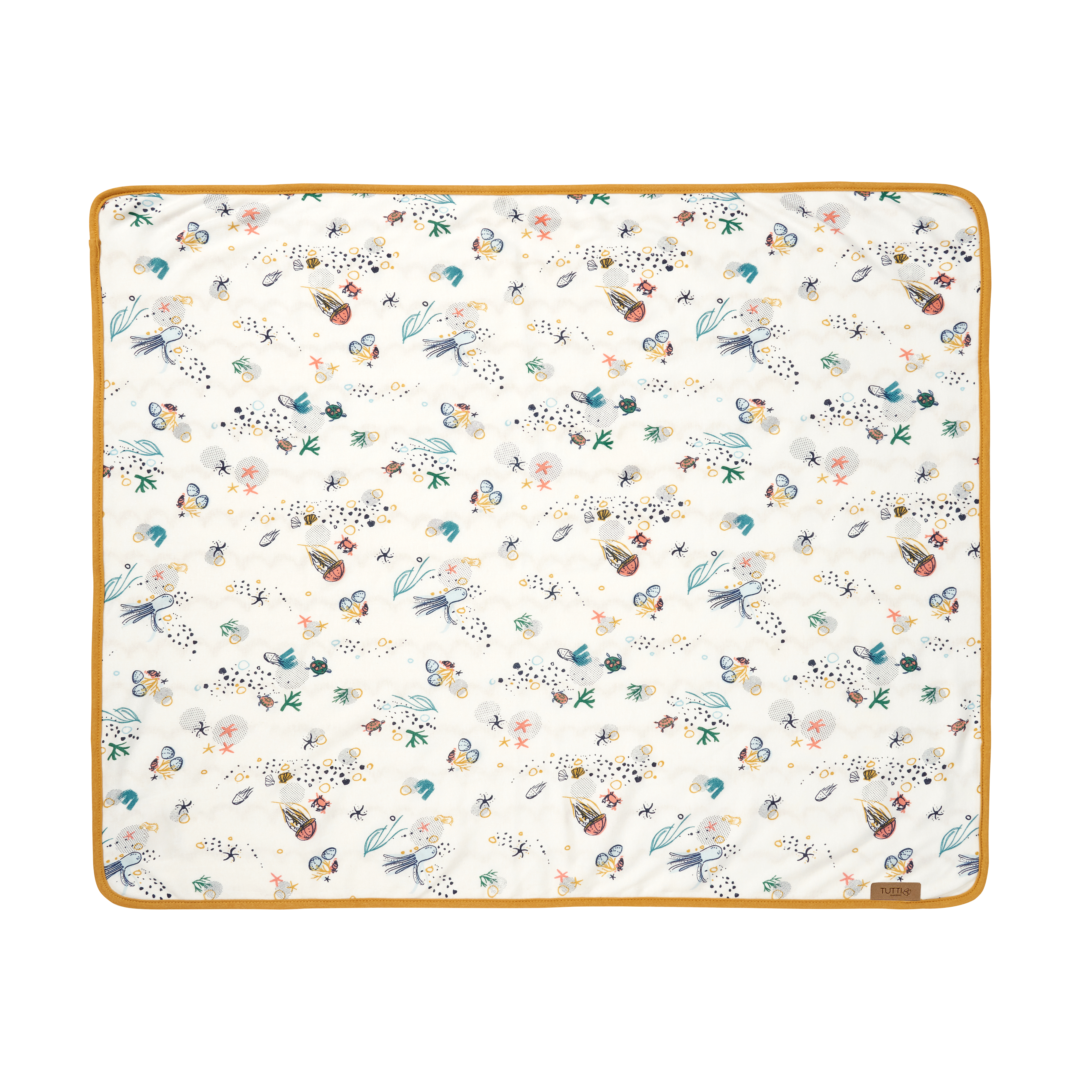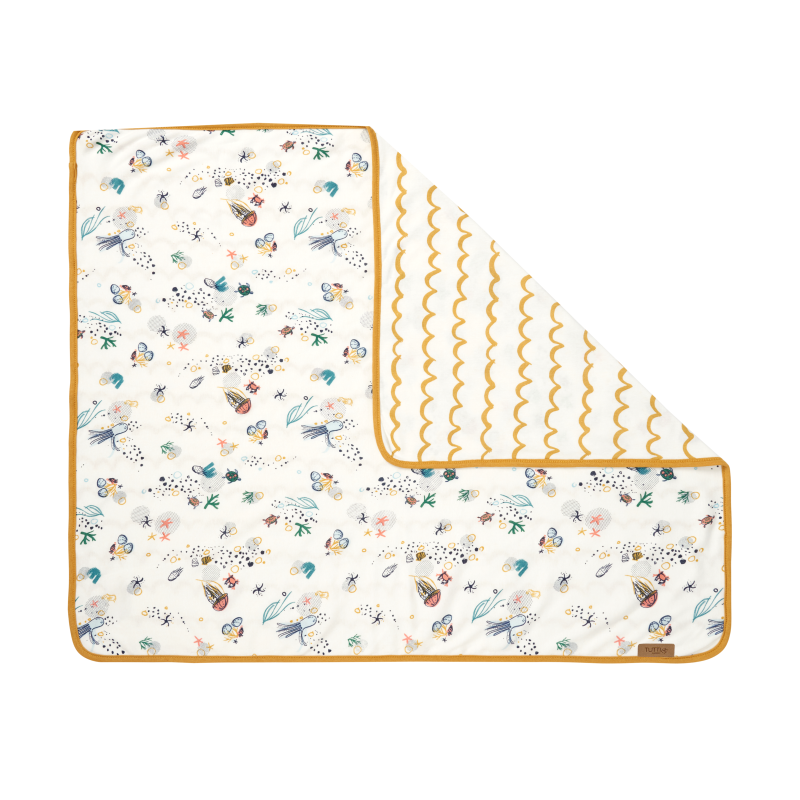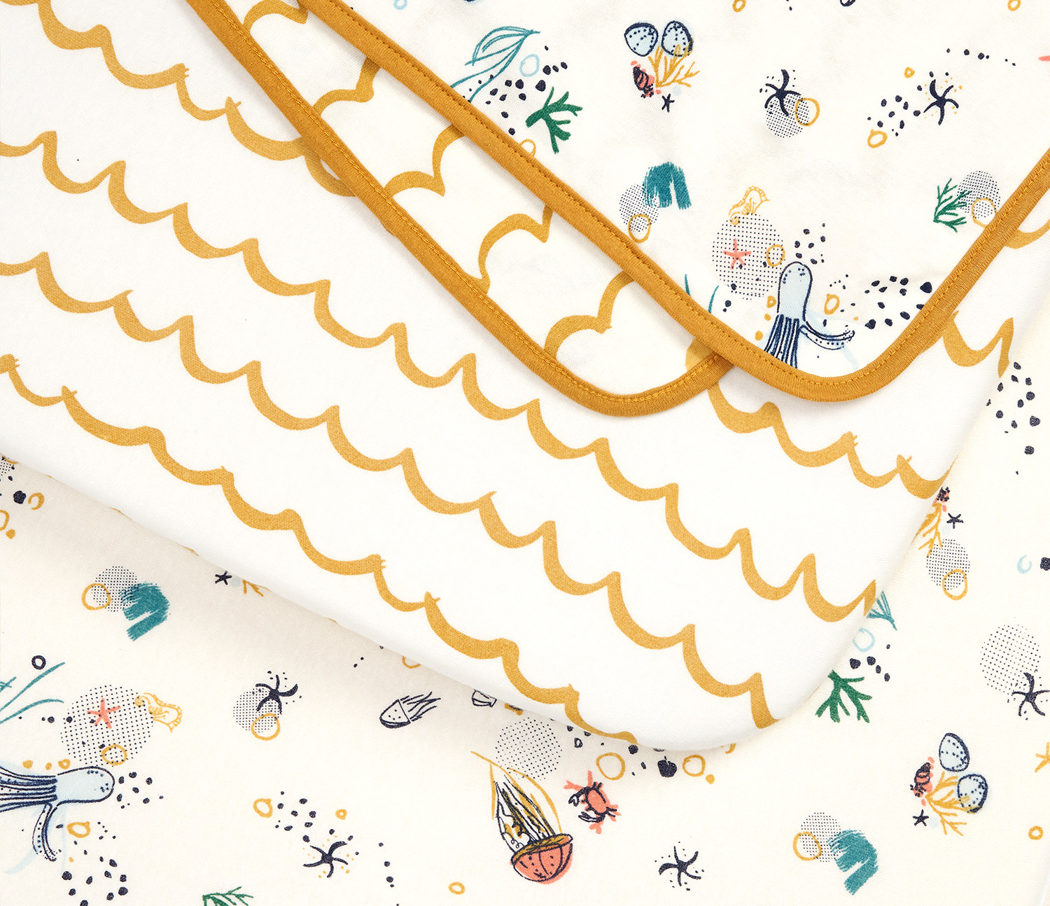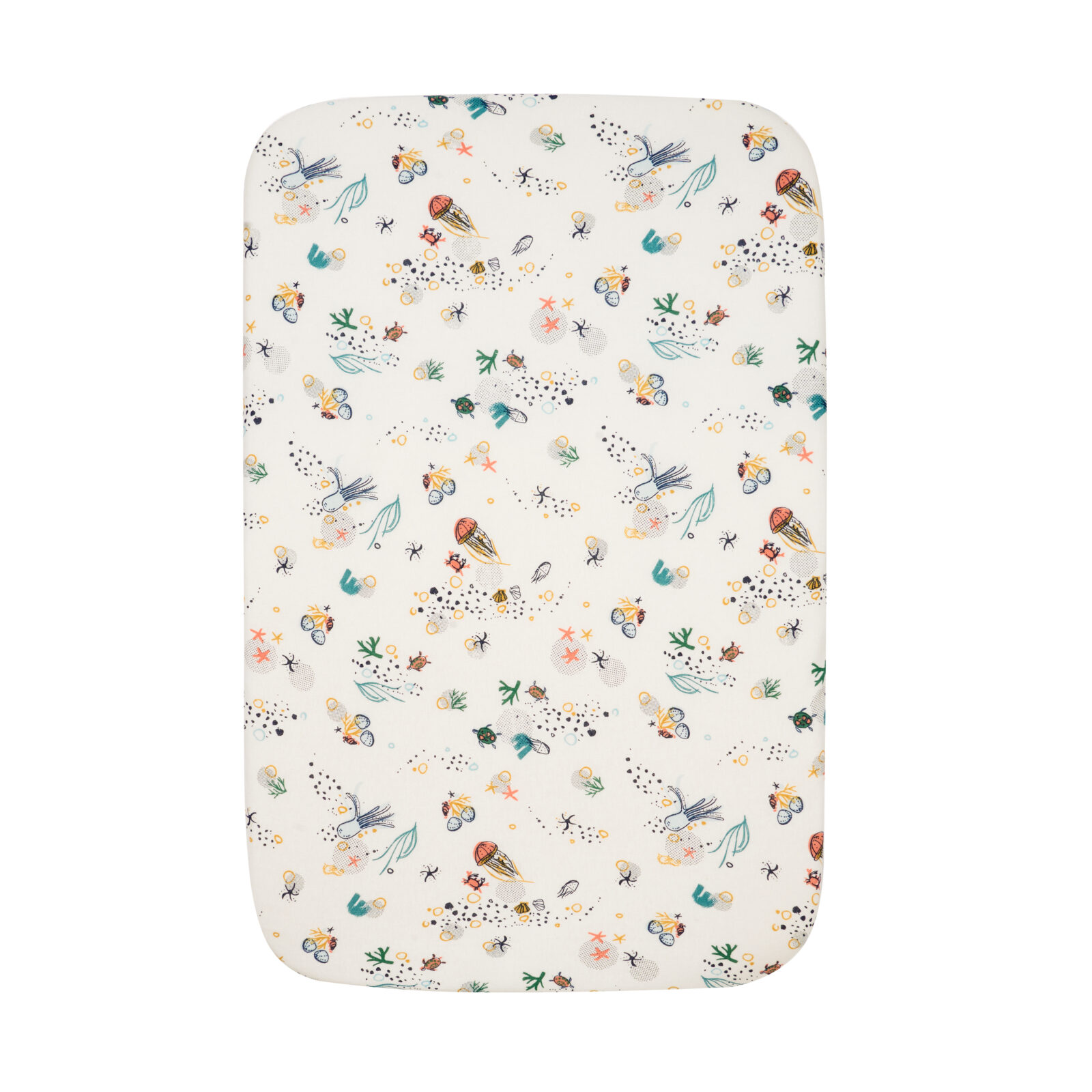 Colour: Part of the Our Planet collection. One sheet features colourful sea motifs like octopus, jellyfish, sea stars, crabs and turtles, whilst the other sheet design evokes the sea waves. Both print designs have a cream base colour. The coverlet matches the crib sheets, and is reversible.