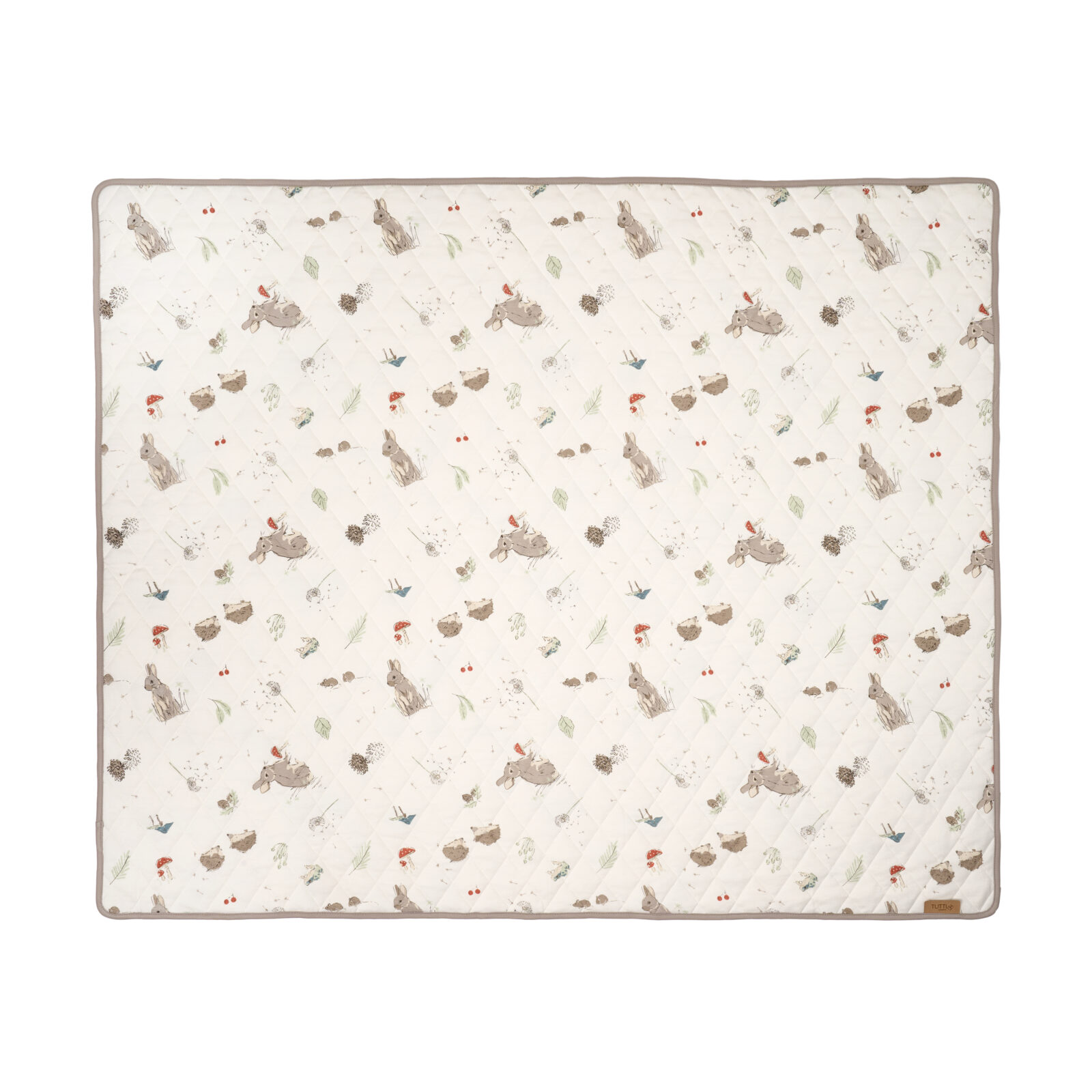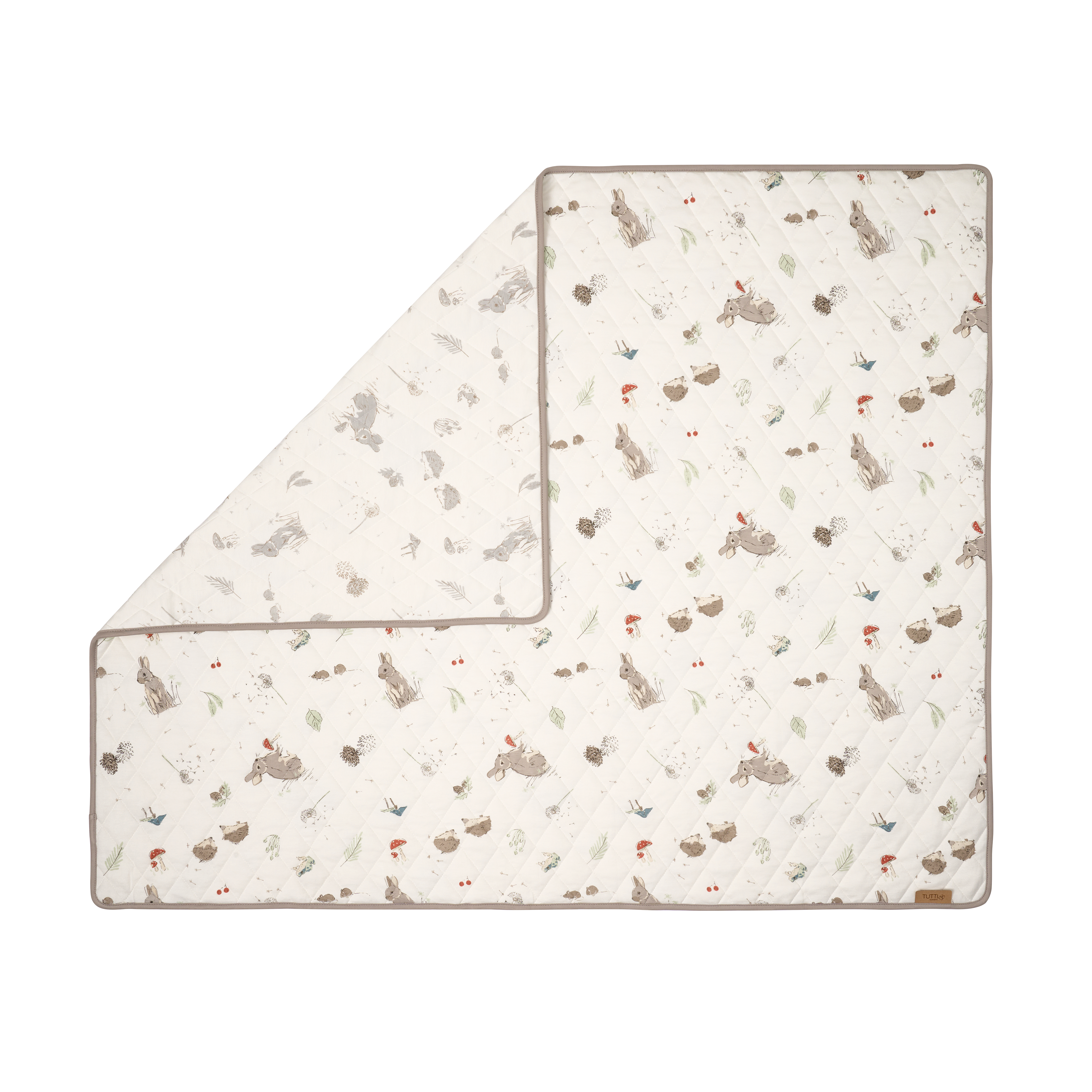Colour: Part of the Cocoon collection. The coverlet features woodland motifs like rabbits, hedgehogs, frogs, wild mushroom and leaves on a cream colour base.