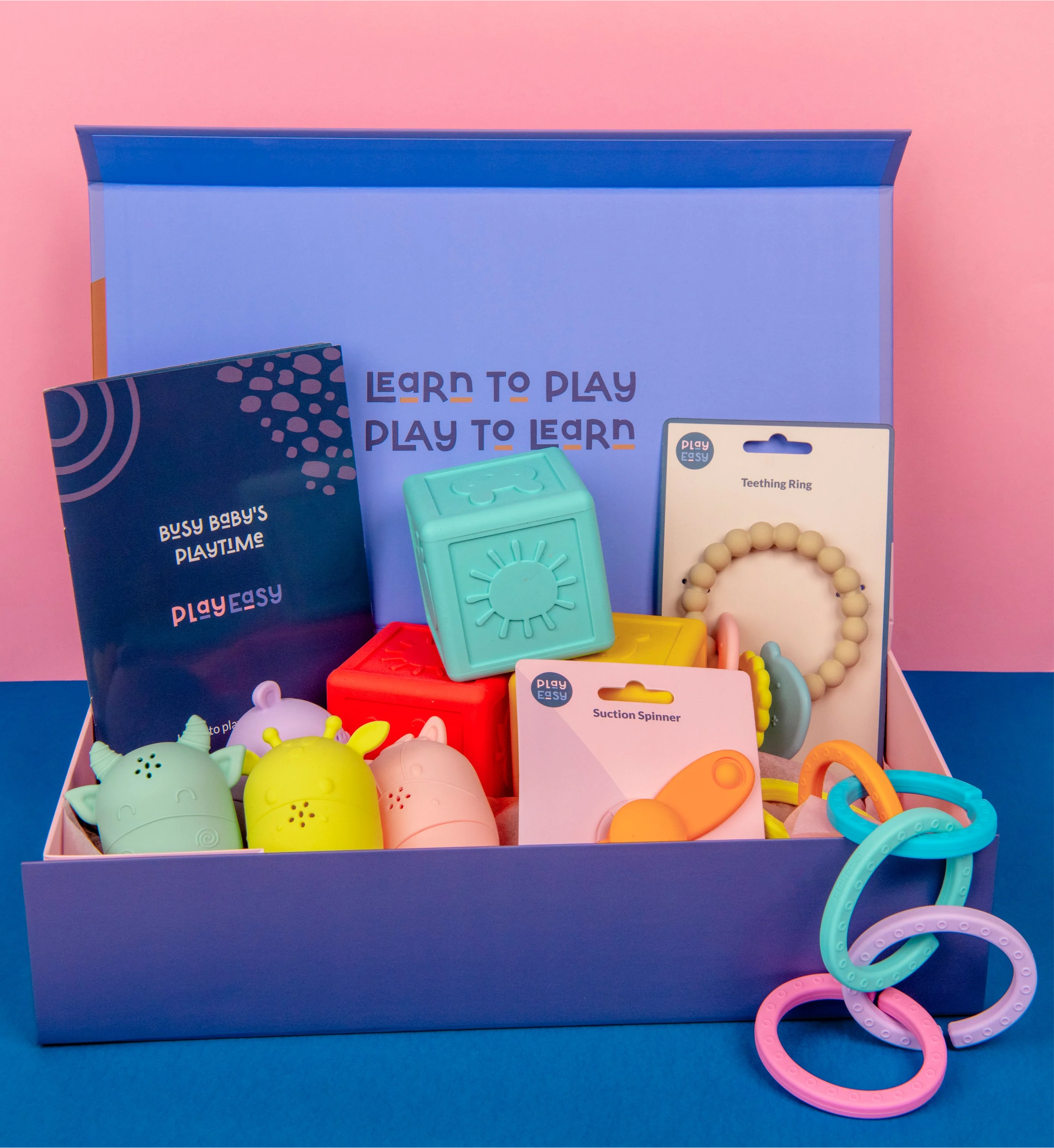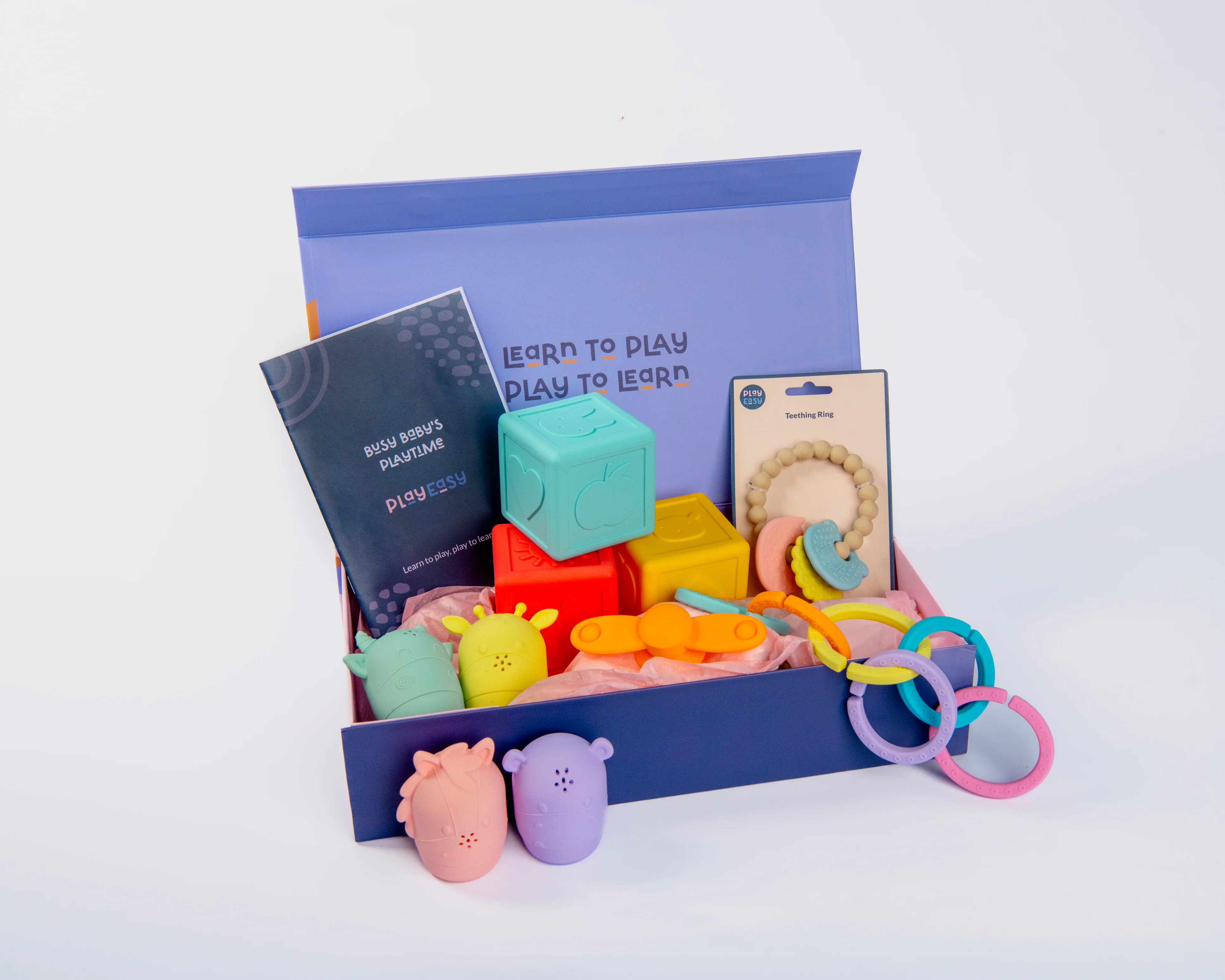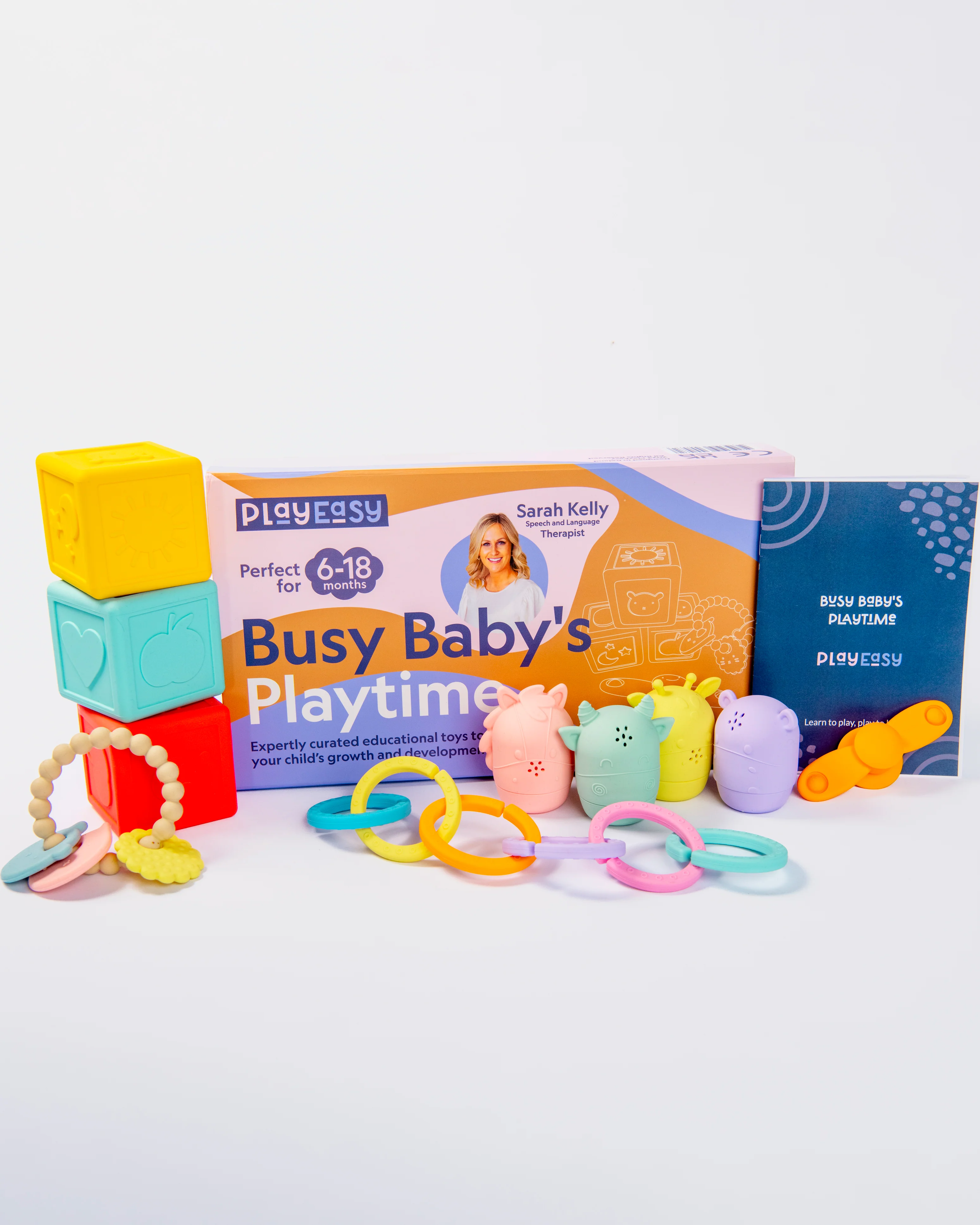 Busy Baby’s Playtime is perfect for babies aged 6-18 months. Designed by Sarah Kelly, a Specialist Speech and Language Therapist to support your baby’s motor skills, attention, interaction, play and communication. Each toy is made from BPA-free, food-grade silicone, ensuring safe and engaging playtime that meets EU and UK safety standards. All the toys are easy to clean with warm soapy water or you can pop them in the top rack of your dishwasher.