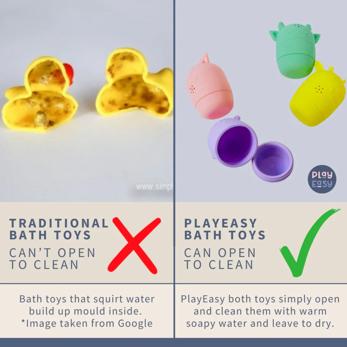 Unlike traditional bath toys, these open easily to prevent mould buildup. Simply wash with warm, soapy water after use and let them air dry. You can also pop them in the top rack of your dishwasher. Certified to meet EU and UK safety standards, these toys are ready for safe and engaging play.