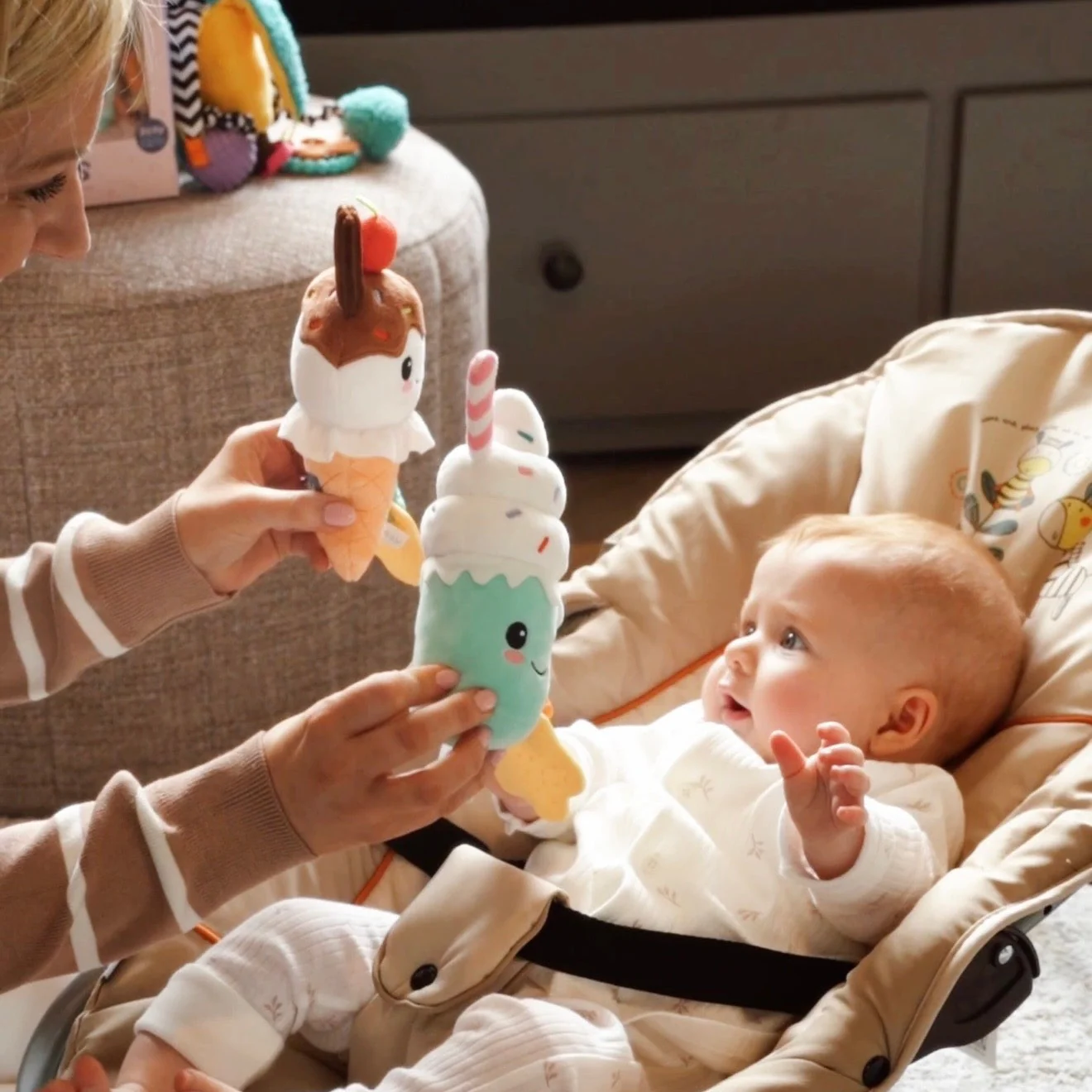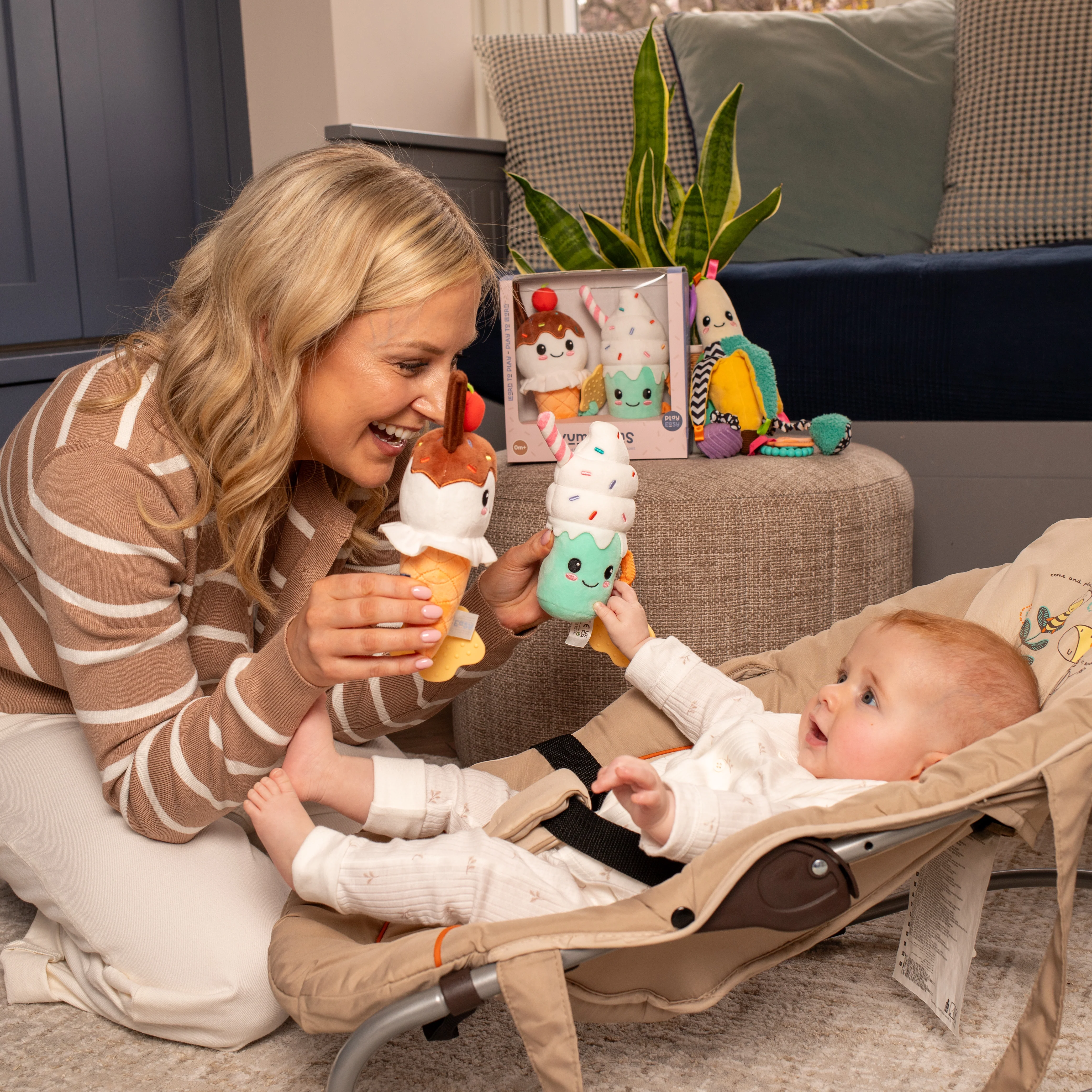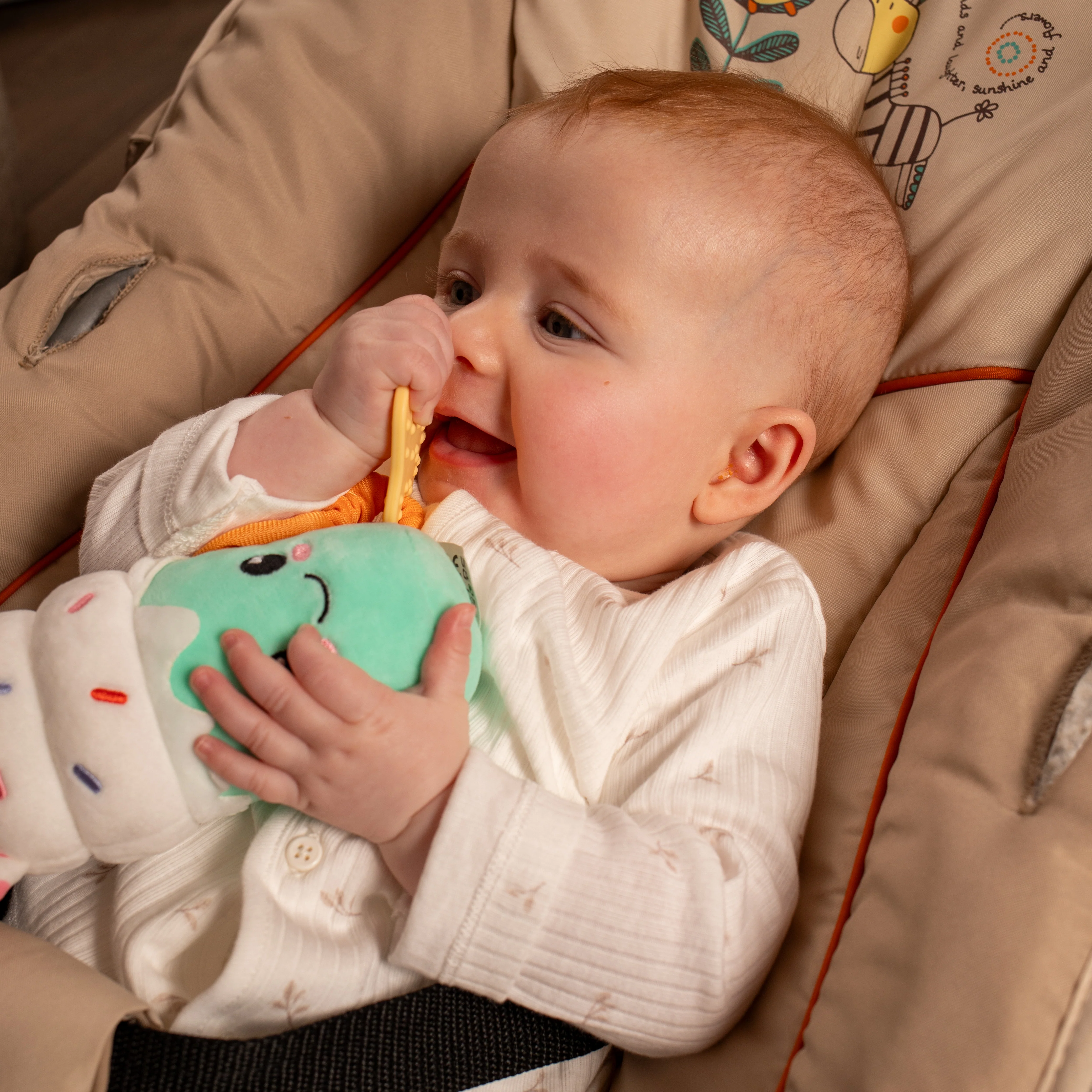 Soft plush textures, a gentle rattle bell, playful squeakers and silicone teether elements engage multiple senses while supporting early exploration. The expressive faces naturally encourage eye contact and shared smiles.