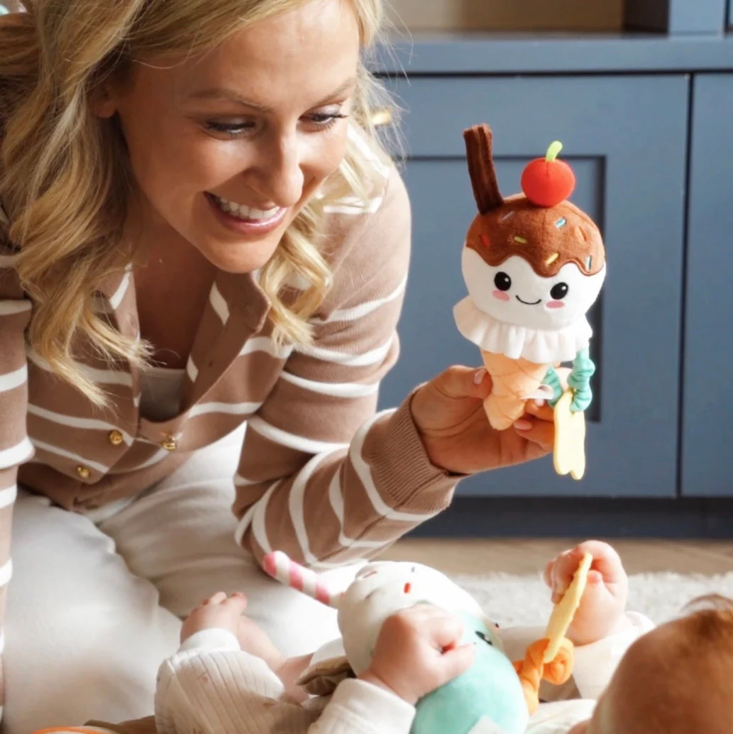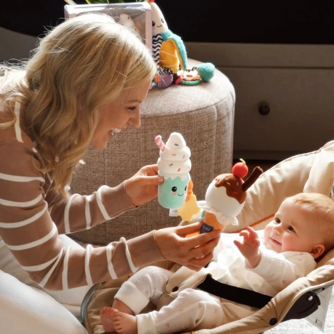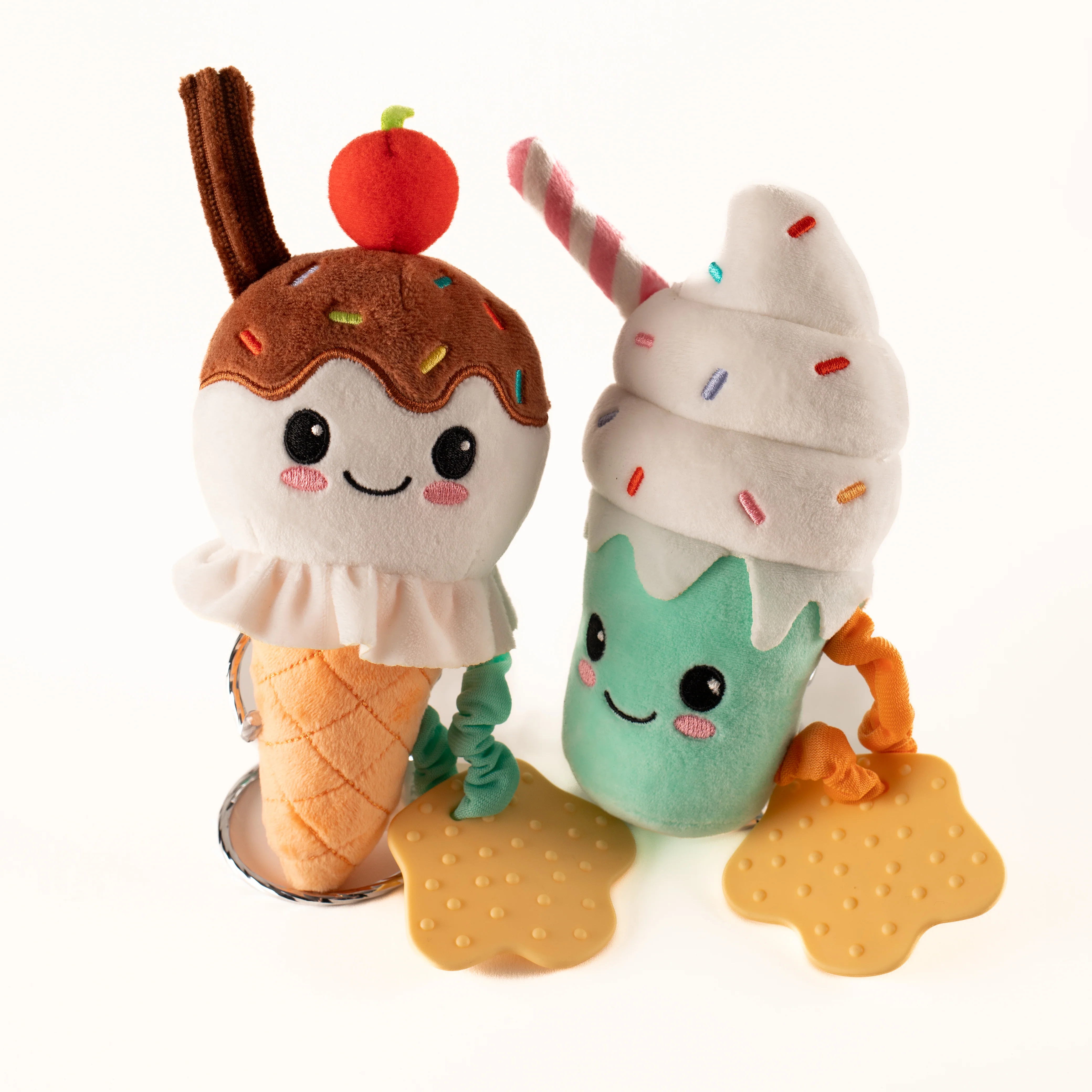 Soft plush textures, a gentle rattle bell, playful squeakers and silicone teether elements engage multiple senses while supporting early exploration. The expressive faces naturally encourage eye contact and shared smiles.