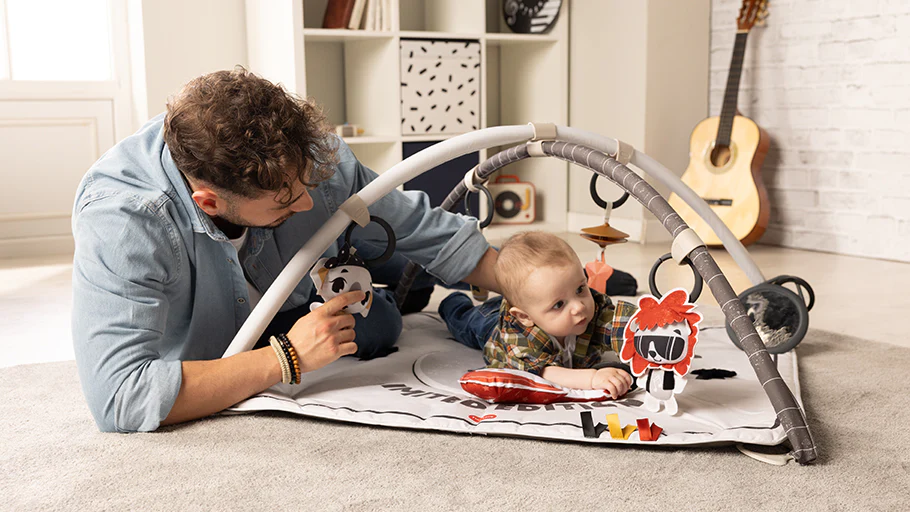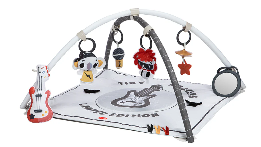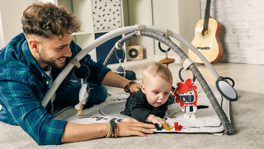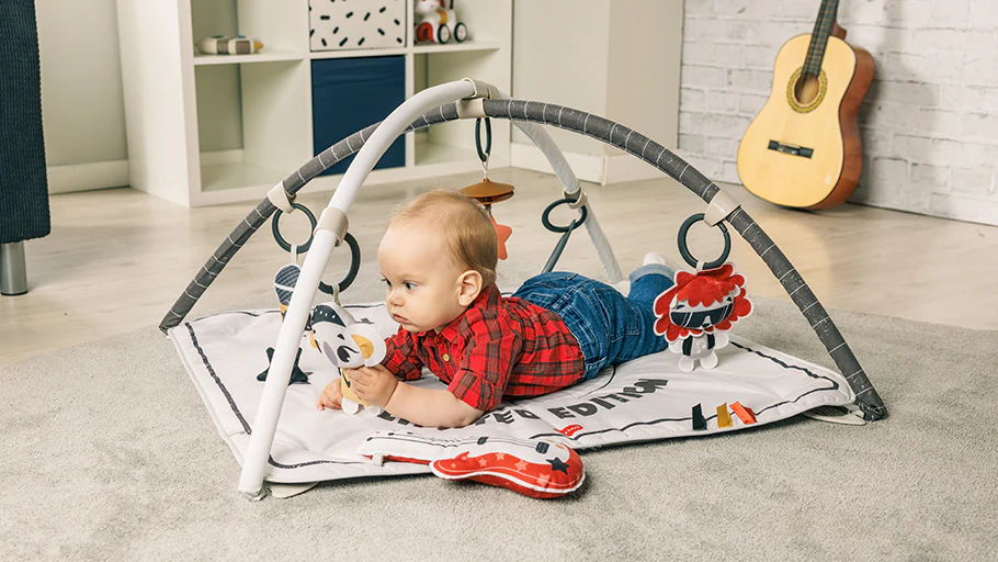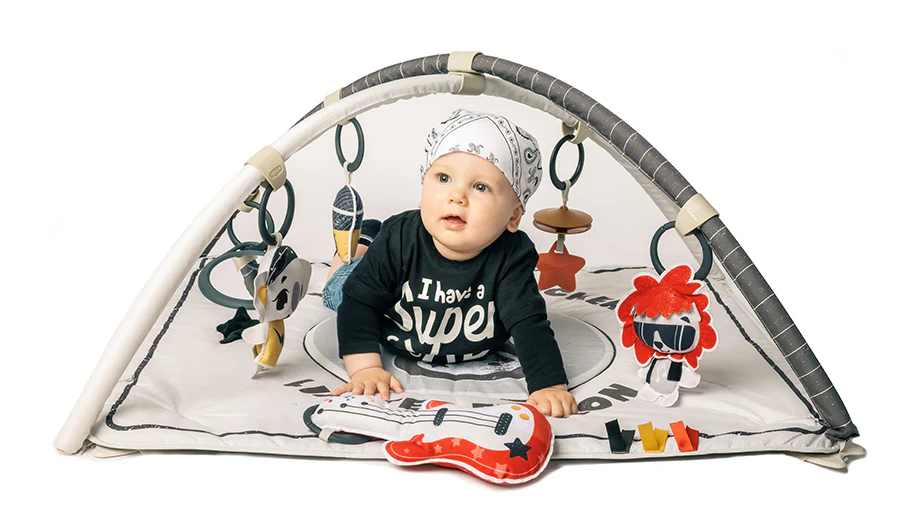 The Gymini’s satin ribbons, plush crinkly stars and other elements enrich baby’s tactile experience and encourage grasping and holding, helping little muscles grow stronger.