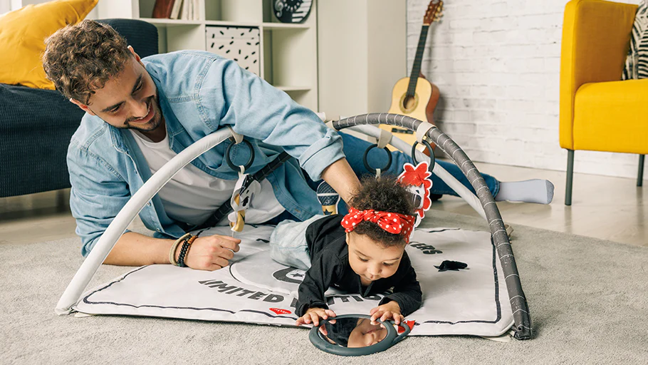 To help extend tummy time, engage your baby by pointing to the different textures of the crinkly star or position your little one in front of the soft musical guitar or mirror.